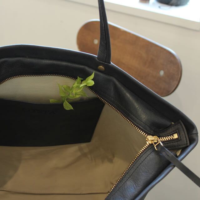 内側は、明るく中の見やすいベージュの裏地に本体と同じレザーのポケットを付けました。